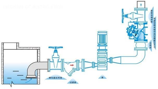 當(dāng)水泵起動(dòng)起后,水壓作用于主閥閥盤下面和控制室下腔,此壓力使主閥開啟,控制室上腔的水經(jīng)過調(diào)節(jié)閥B緩緩排到出口端,主閥緩緩開啟。設(shè)定調(diào)節(jié)閥的開度可得到合適地主閥開啟速度。當(dāng)水泵停止工作后,進(jìn)口端水壓迅速下降,在自重、彈簧壓力作用下快速關(guān)閉大部分開度,防止了水倒流余下的開度由控制室上腔的水壓和下腔水壓聯(lián)合作用下緩緩關(guān)閉,關(guān)閉速度減慢形成了緩沖,防止壓力劇增。