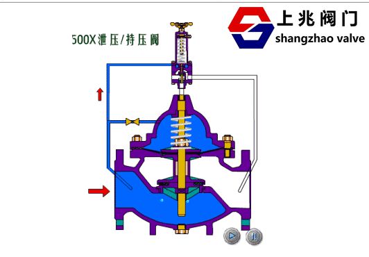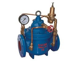500X不銹鋼泄壓閥由主閥、泄壓/持壓導(dǎo)閥針閥、球閥、微形過(guò)濾器和壓力表組成水力控制接管系統(tǒng)。利用水力自動(dòng)操作,即可以作泄壓閥用又可作持壓閥用。作泄壓閥用時(shí),可維持供水路壓力在設(shè)定的安全值之下;做持壓閥用,可維持主閥上游水壓在設(shè)定值之上,保持主閥上游供水壓力。 1、作泄壓閥:當(dāng)泄壓/持壓導(dǎo)閥調(diào)整為泄壓狀態(tài)時(shí),水通過(guò)針閥、主閥控制室、球閥A、泄壓/持壓導(dǎo)閥、球閥B流向出口,此時(shí)主閥處于開(kāi)啟狀態(tài)。當(dāng)進(jìn)口壓力超過(guò)泄壓/持壓導(dǎo)閥設(shè)定的安全值時(shí),泄壓導(dǎo)閥會(huì)自動(dòng)開(kāi)啟,通過(guò)球閥C放出部分水,使管路泄壓。當(dāng)壓力恢復(fù)到安全值時(shí),泄壓閥自動(dòng)關(guān)閉。作泄壓閥時(shí),各球閥常開(kāi)。 2、作持壓閥:當(dāng)泄壓/持壓導(dǎo)閥調(diào)整為持壓狀態(tài)時(shí),只要主閥進(jìn)口水壓低于導(dǎo)閥設(shè)定值,導(dǎo)閥即關(guān)閉。主要控制室升壓,主閥關(guān)閉。當(dāng)主閥上游供水壓力超過(guò)導(dǎo)閥設(shè)定壓力時(shí),持壓導(dǎo)閥才能打開(kāi),控制室的水經(jīng)球閥排至出口,控制室降壓主閥開(kāi)啟,開(kāi)始供水,即保持了上游水壓。作持壓閥用時(shí),球閥C常閉或用絲堵?lián)Q下。 三、500X 不銹鋼泄壓閥--主要技術(shù)參數(shù):