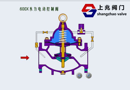 水力控制閥是以管路系統(tǒng)上下游壓力差△p為動力,由導(dǎo)閥控制,使隔膜(活塞)液壓式差動操作,完全由水力自動調(diào)節(jié),從而使主閥閥盤完全開啟、完全關(guān)閉或處于調(diào)節(jié)狀態(tài)。當(dāng)進(jìn)入隔膜(活塞)上方控制室內(nèi)的壓力介質(zhì)被排到大氣或下游低壓區(qū)時,作用在閥盤底部和隔膜下方的壓力值大于上方的壓力值,依靠管路介質(zhì)將主閥閥盤推到完全開啟的位置: