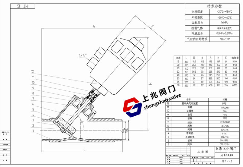 產(chǎn)品介紹 焊接氣動角座閥(塑料頭)--工作原理: 在非工作狀態(tài)時,由于彈簧力作用,閥門常閉(開)。當執(zhí)行器活塞被壓縮氣體作用時,閥門打開(關(guān)閉)。雙作用形式靠壓縮氣體控制閥門開關(guān)。 焊接氣動角座閥(塑料頭)--應(yīng)用范圍: 啤酒飲料灌裝設(shè)備 制藥及醫(yī)療設(shè)備 印染紡織 化工行業(yè) 氣體工業(yè) 高溫滅菌 發(fā)泡機械 水/污水處理 焊接氣動角座閥(塑料頭)--特點: 流量大,流阻小,無水錘 Y型設(shè)計,增加30%流量 超長使用壽命 閥桿自動校正,自潤滑,免維護 氣缸采用不銹鋼材質(zhì),在惡劣環(huán)境中更加優(yōu)秀,可360°旋轉(zhuǎn)。 焊接氣動角座閥(塑料頭)--技術(shù)參數(shù): 管道壓力:Max1.6Mpa(232psi) 控制壓力:0.3-0.8Mpa(43.5-116psi) 控制介質(zhì):中性氣體或空氣 閥體材料:CF8M/CF8(SS316,SS304) 密封材料:聚四氟乙烯 氣缸材料:塑料PPS 氣缸尺寸:27mm,32mm,40mm,50mm,63mm, 80mm,100mm,125mm 適用介質(zhì):水,酒精,油,染料,蒸汽,中性氣體或液體,有機溶劑,酸堿溶液 介質(zhì)溫度:-10℃-+180℃,25℃-+220℃ 環(huán)境溫度:-10℃-+80℃ 控制形式:單作用常閉,常開,雙作用常閉,雙作用自由態(tài) 連接形式:螺紋式,焊接式,法蘭式,快裝式 焊接氣動角座閥(塑料頭)圖紙: ![]() | ||
