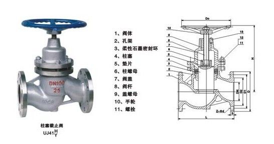 U41M鑄鋼柱塞閥是由閥體、閥蓋、閥桿、柱塞、密封圈、手輪等零七八碎件組成(如圖)。當旋轉手輪時,通過閥桿帶動柱塞,使柱塞頂斜錐面與閥座錐面往復離合,完成閥門的開啟和關閉。