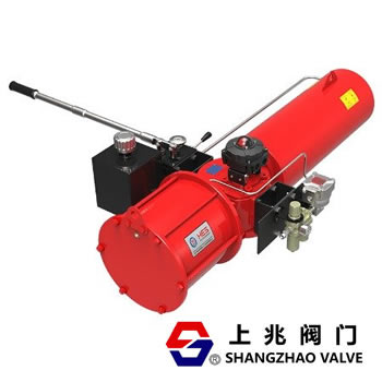 氣動(dòng)帶液壓煤氣切斷閥--工作原理: 氣動(dòng)帶液壓煤氣切斷閥由單作用(雙作用)氣動(dòng)裝置,由單作用(雙作用)氣缸.活塞.連桿.箱體輸出軸等零件組成的機(jī)械傳動(dòng)機(jī)構(gòu)和電磁閥.過濾減壓閥等控制元件組成。當(dāng)氣動(dòng)執(zhí)行裝置與電路和系統(tǒng)氣源接通后,電磁閥接收到24V電壓信號(hào)轉(zhuǎn)換成輸出氣壓力,使壓縮空氣進(jìn)入缸體一端,推動(dòng)活塞向另一端移動(dòng),活塞通過連桿等零件帶動(dòng)輸出軸運(yùn)轉(zhuǎn)實(shí)現(xiàn)閥門快速啟閉。同時(shí)回訊器根據(jù)閥門的啟閉位置來反饋輸出的控制信號(hào)正確定位。上兆閥門的執(zhí)行器采用G系列執(zhí)行器具備了氣動(dòng)動(dòng)力,液動(dòng)動(dòng)力,彈簧動(dòng)力,手動(dòng)控制等功能模塊。所有功能模塊均可相互組合、相互更換,用戶可根據(jù)閥門工藝控制流程的功能需要,選擇各種模塊。模塊也可以單獨(dú)購買,減少了備品備件的庫存。