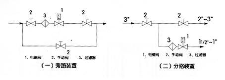 1、安裝時電磁閥線圈向上,并保持垂直位置,電磁閥上箭頭或標記應與管道流向一致,不得安裝在有濺水或漏水的地方。 2、電磁閥的工作介質(zhì)應清潔無顆粒雜質(zhì),電磁閥內(nèi)件表面上的污物及過濾器,需定期清潔干凈。 3、在電磁閥發(fā)生故障時,為了及時隔離電磁閥,并保證系統(tǒng)正常運行,最好安裝旁路裝置(如圖一)。 4、在管路系統(tǒng)中,安裝在支路上的電磁閥通徑應小于主管道閥門的通徑(如圖二)。 5、安裝電磁閥前,管道必須清洗干凈。建議在電磁閥前安裝過濾器,蒸汽管道安裝疏水閥。 6、不能將電磁閥安裝在管道的低凹處,以免因蒸汽冷凝水、雜質(zhì)等沉淀在閥內(nèi)而防礙動作。 7、普通型電磁閥不能在爆炸危險場合使用。 8、在管路剛性不足情況下,建議把電磁閥前管道用支架固定,以免電磁閥工作時引起振動。 9、在安裝電磁閥前,要注意看清產(chǎn)品電磁閥標牌,認真閱讀使用說明書電磁閥,判斷電磁閥產(chǎn)品是否符合使用條件。 10、電磁閥前后管道上需安裝壓力表,以便觀察管道壓力。