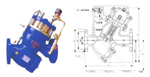 產(chǎn)品介紹 一、YQ98006型過濾活塞式電磁控制閥--產(chǎn)品概述: YQ98006型過濾活塞式電磁控制閥由主閥、電磁導(dǎo)閥、針閥、球閥、微形過濾器組成水力控制接管系統(tǒng);通過電磁導(dǎo)閥可以實現(xiàn)對閥門開啟和關(guān)閉的遙控,當(dāng)閥門從進(jìn)口端給水時,水流流過針閥進(jìn)入主閥上腔控制室,當(dāng)電磁導(dǎo)閥打開時,控制室內(nèi)的水經(jīng)電磁導(dǎo)閥、球閥流出。球閥開度大于針閥開度,主閥上腔控制室內(nèi)壓力變低,主閥處于全開狀態(tài);當(dāng)電磁導(dǎo)閥關(guān)閉時。 主閥上腔控制室的水不能流出,控制室升壓,推動活塞關(guān)閉主閥;本產(chǎn)品利用導(dǎo)閥控制閥門的開啟和關(guān)閉,反映準(zhǔn)確快速,采用三向電磁閥,維護(hù)簡單;安裝于各類給水系統(tǒng)的管道上。 二、YQ98006型過濾活塞式電磁控制閥--工作原理: 分隔膜型和活塞型兩類,主要部件有一個主閥及其附設(shè)的導(dǎo)管、導(dǎo)閥、針閥、球閥和壓力表等組成的。它利用上下游壓力差為動力,由導(dǎo)閥控制、使隔膜(活塞)上方控制室內(nèi)的壓力水被排到大氣或下游低壓區(qū)時,作用在閥盤底部和隔膜下方的壓力值就大于上方的壓力值,所以將主閥閥盤推到完全開啟的位置,當(dāng)進(jìn)入隔膜(活塞)上方控制室內(nèi)的壓力不能排到大氣或下游低區(qū)時,作用在隔膜(活塞)上方的壓力值就大于下方的壓力值,所以就會把主閥閥盤壓到完全關(guān)閉位置,當(dāng)隔膜(活塞)上方控制室內(nèi)的壓力值處于入口壓力與出口壓力中間時,主閥閥盤就處于調(diào)節(jié)狀態(tài)。 三、YQ98006型過濾活塞式電磁控制閥--技術(shù)參數(shù):