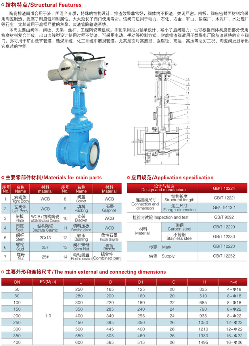 產(chǎn)品介紹 PZ941TC電動(dòng)耐磨陶瓷排渣閥產(chǎn)品概述: PZ941TC 電動(dòng)耐磨陶瓷排渣閥適用于公稱壓力P N 1.6~6.4Mpa,工作溫度0~100℃的火力電站水利排渣系統(tǒng)及水利工程的灰漿排放系統(tǒng)管路上,切斷或接通管路中聽介質(zhì),適用介質(zhì)為:灰水混合物,渣水混合物。 PZ941TC電動(dòng)耐磨陶瓷排渣閥優(yōu)點(diǎn): PZ941TC 電動(dòng)耐磨陶瓷排渣閥主要應(yīng)用于電力、石油、化工、冶金、采礦、污水處理等工業(yè)領(lǐng)域,尤其是面對(duì)高磨損、強(qiáng)腐蝕、高溫、高壓等惡劣工況,陶瓷閥更顯示出它卓越的性能。 PZ941TC 電動(dòng)耐磨陶瓷排渣閥能滿足高磨損、強(qiáng)腐蝕的使用環(huán)境,尤其突出的特點(diǎn)是超長的使用壽命,陶瓷閥門的性能價(jià)格比遠(yuǎn)遠(yuǎn)優(yōu)于其它同類金屬閥門。 PZ941TC電動(dòng)耐磨陶瓷排渣閥結(jié)構(gòu)優(yōu)勢(shì)與特點(diǎn): 1、 采用中法蘭螺栓連接,支管兩端為法蘭連接結(jié)構(gòu)。 2、 啟閉件采用半密封副強(qiáng)制密封,性能優(yōu)良。 3、 密封副材料為耐磨合金,耐磨性強(qiáng)、耐沖蝕、耐擦傷、摩擦力小、密封可靠。 4、 閥體出流道線型合理,不存渣,啟閉靈活,不卡阻。 5、 閥桿表面經(jīng)調(diào)質(zhì)及氮化處理,有良好的抗腐蝕性,抗擦傷和耐磨性。 6、 中大口徑設(shè)置滾動(dòng)軸承,啟閉輕松。 PZ941TC電動(dòng)耐磨陶瓷排渣閥試驗(yàn)壓力:
