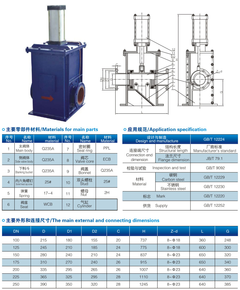 安裝前應(yīng)將閥門(mén)清洗干凈,并消除在運(yùn)輸過(guò)程中可能造成的缺陷。仔細(xì)核對(duì)閥門(mén)上的標(biāo)識(shí)及銘牌是否符合使用要求。本閥門(mén)只能安裝在水平管道上。若長(zhǎng)期存放,應(yīng)存在于干燥通風(fēng)的室內(nèi),定期檢查,防止生銹。運(yùn)輸過(guò)程中防止磕碰。 庫(kù)頂切換閥--技術(shù)參數(shù): 1、 公稱(chēng)通徑: DN50~900mm(2”~36”) 2、 公稱(chēng)壓力: PN1.0~4.0MPa(150~300Lb) 3、 適用溫度: ≤200℃ 4、 適用介質(zhì):灰渣、泥渣、煤渣、礦漿、污水等 5、 應(yīng)用范圍:電力、石化、冶金、建材等工藝控制系統(tǒng) 6、 材質(zhì): 碳鋼 不銹鋼等 ![]() | ||